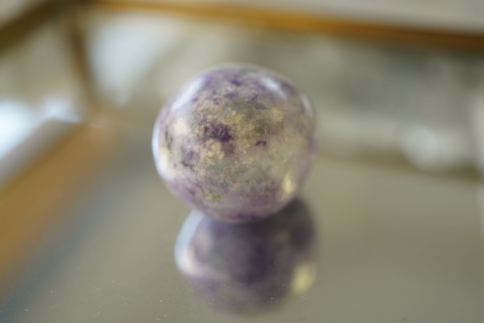ベリーのような赤紫や菫色、若草のようなミントブルーが複雑に絡み合った色味が特徴的なこのタンブルは、神秘的で深みのある色合いが魅力です。