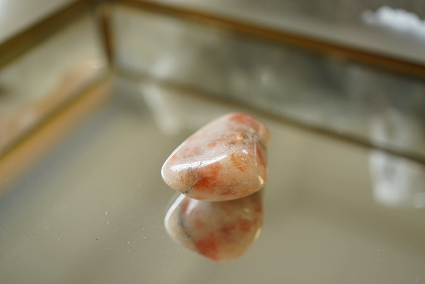 サンストーンは長石の仲間で、薄い半透明の板状結晶が重なり、層の間に光が入ることで虹色のシラーと呼ばれる輝きが見られます。
