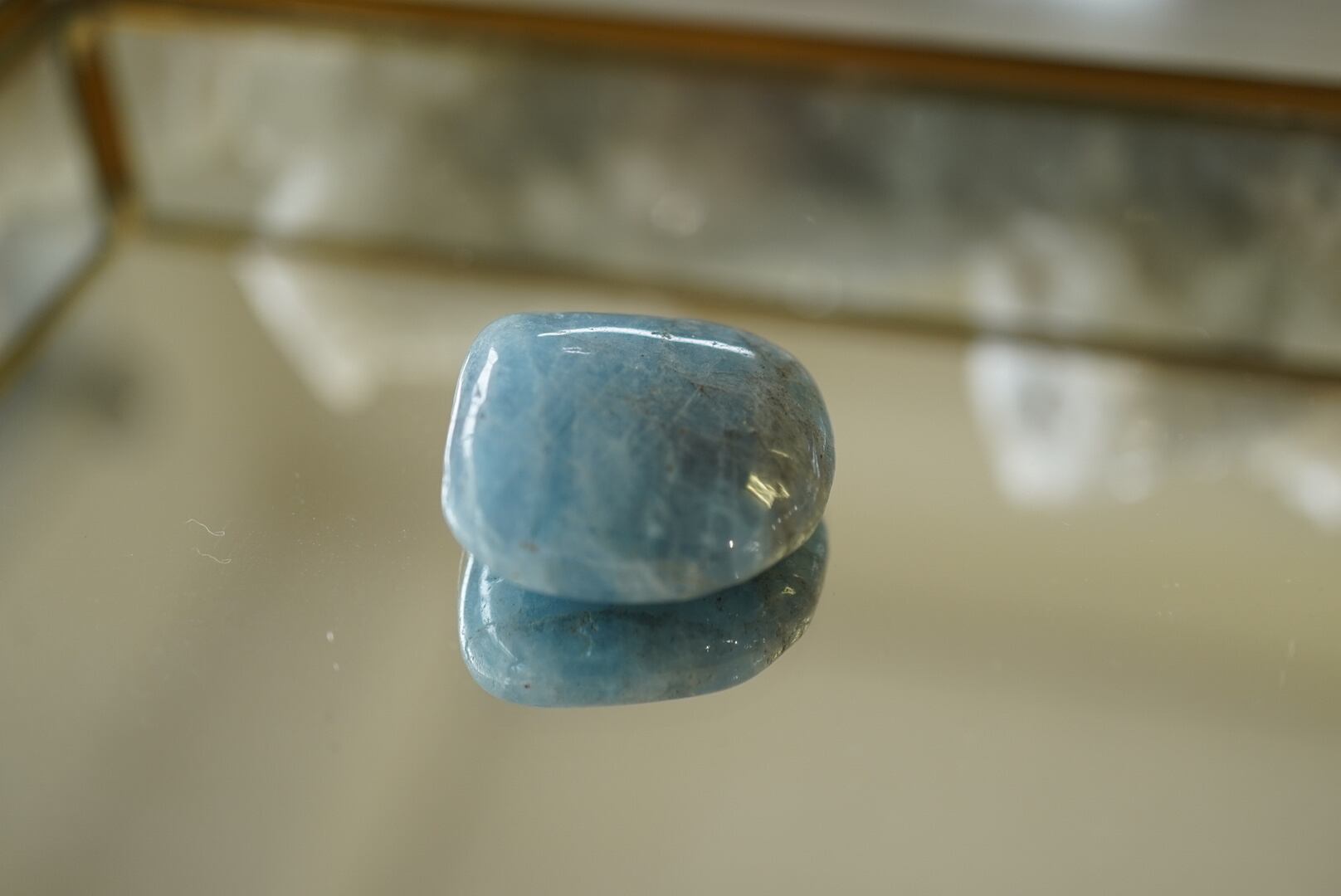 澄んだ青色と優雅な光沢が特徴のこのタンブルは、見る者に穏やかな心の安らぎをもたらす魅力を秘めています。