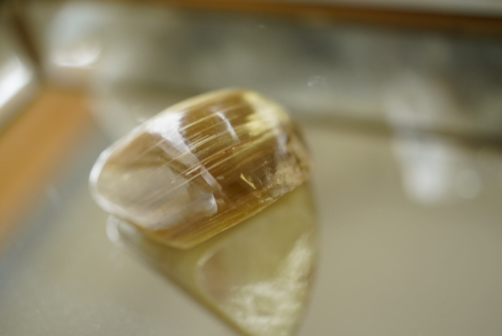 脆い鉱物なので研磨すること自体が難しいものなのですが、重なっている面は光を通さず反射するので、非常に美しいメタリックな輝きを見せます。